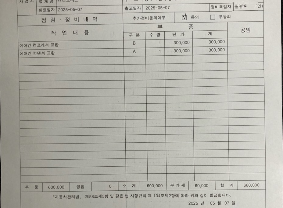 에어컨 이슈는 작년 시작되었고 에어컨 바람이 시원하지 않아 근처 마트 정비소를 방문하였고 정비사님께서는 에어컨을 틀었을 때 "쉬이익" 하는 바람이 새는 듯한 소리를 들으시고 가스가 새는 것 같다고 하시면서 단순히 가스 충전으로는 근본적인 문제가 해결되지 않는다고 하셨습니다.