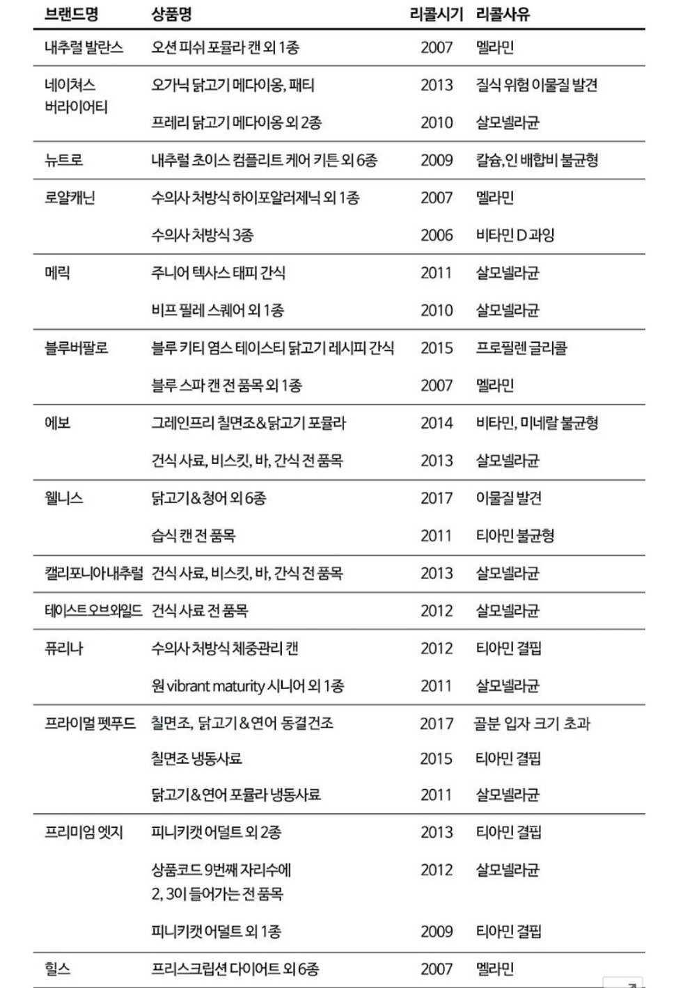 ** 2018년 기준 고양이 사료 리콜이력