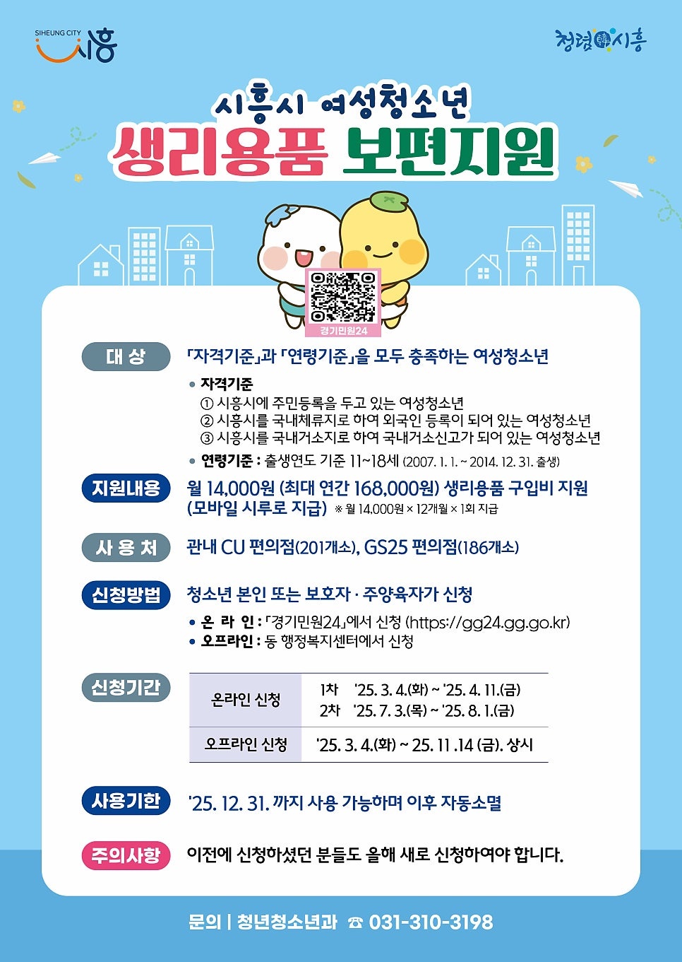 1. 대상 : 시흥시에 주민등록, 외국인등록, 국내거소신고를 한 11세~18세 여성청소년